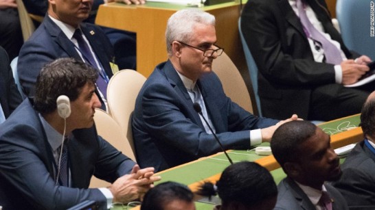 Khi ông Trump tấn công chính phủ Iran bằng những lời lẽ nặng nề, các máy quay phim đã ghi lại được cảnh một thành viên trong phái đoàn Iran lặng lẽ bấm điện thoại rồi chỉnh gọng kính.