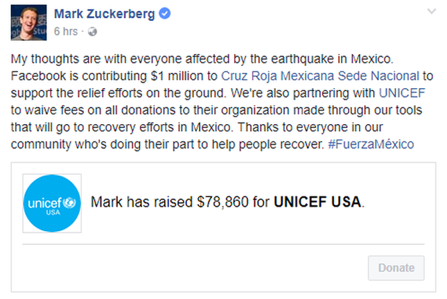 "Tôi xin chia buồn sâu sắc với những người bị ảnh hưởng bởi trận động đất tại Mexico. Facebook sẽ quyên góp 1 triệu USD cho Hội Chữ Thập Đỏ Mexico để hỗ trợ, giảm thiểu những mất mát cho người dân tại đây. Chúng tôi cũng hợp tác với tổ chức UNICEF để quyên góp tiền thông qua những công cụ của Facebook. Số tiền này sẽ được gửi tới các tổ chức nhằm giúp đỡ người dân Mexico. Cảm ơn tất cả mọi người đã chung tay giúp đỡ #FuerzaMexico".