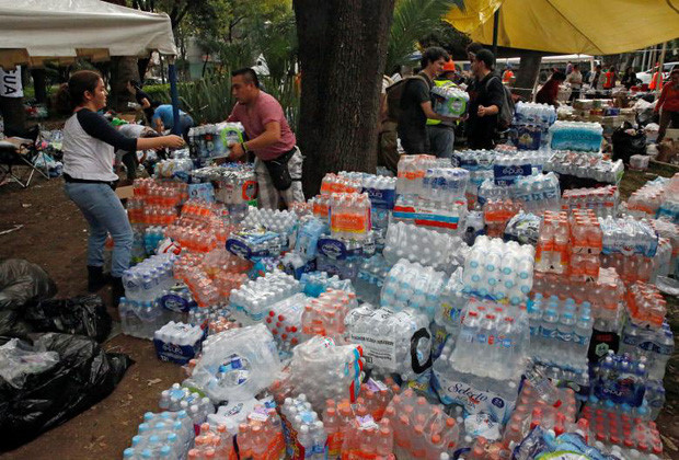 Các tổ chức từ thiện, tiếp tế nước cho các nạn nhân động đất.