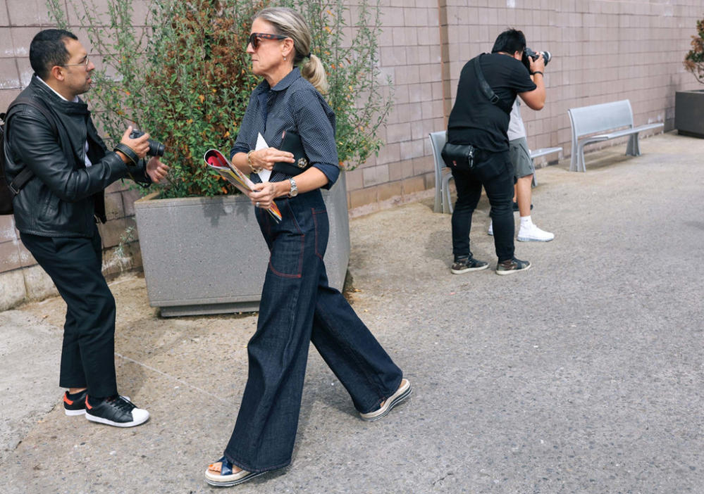 Diện chiếc quần jeans ống suông cổ điển, cụ bà thể hiện phong cách riêng khi mix cùng áo sơ mi cùng tone màu, dép tông cao và túi cầm tay đơn giản.