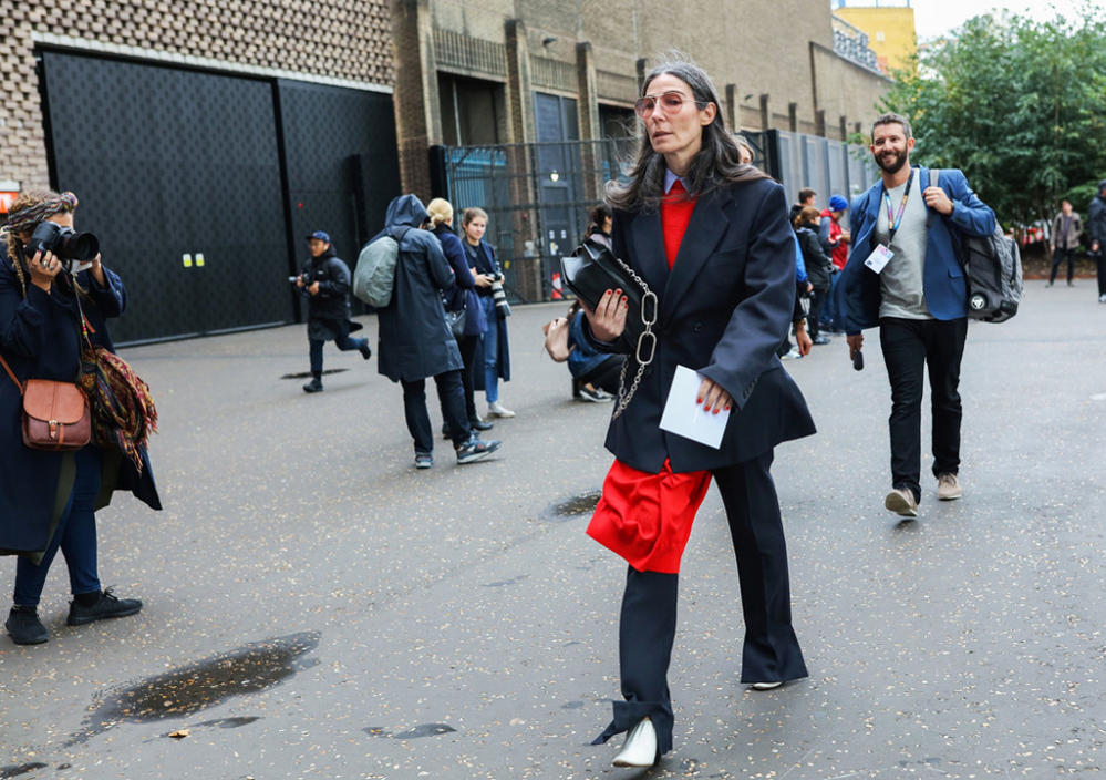 Kết hợp áo thun sắc đỏ dáng dài vứi vest cách điệu làm nổi bật tổng thể set đồ khá đơn giản nhưng mạnh mẽ, trẻ trung của cụ bà.