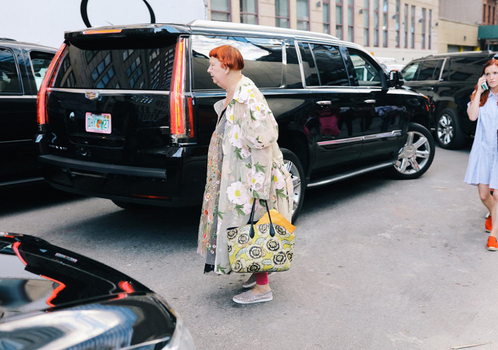Cụ bà tự tin bước trên phố với set đồ được mix&match chiếc áo khoác dáng dài in hoa cùng mẫu quần tây ống ngố, nhấn nhá thêm mẫu túi xách sắc xanh và đôi giày metallic sành điệu.