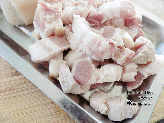 Bước 1: Thịt ba chỉ chần sơ qua nước sôi, rửa sạch thái miếng vừa ăn.