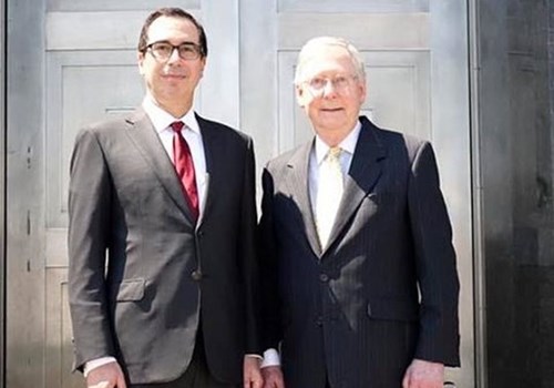 Bộ trưởng Tài chính Steve Mnuchin (trái) và Nhà lãnh đạo Thượng viện Mitch McConnell (bên phải) trước cửa chính của Trung tâm Lưu ký Tiền tệ Hoa Kỳ Fort Knox.