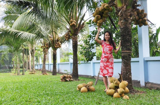 Vườn nhà chị Hồng Tiên có khoảng 70 loại cây ăn trái và cây cảnh, riêng dừa xiêm có khoảng 40 gốc được trồng xung quanh hàng rào. Một số cây cổ thụ như hoa bò cạp vàng, cây bằng lăng, cây phượng, cây me... trồng lấy bóng mát. Cây ăn trái trồng theo cụm và có nhiều loại như xoài, mận, thanh long, lựu, ổi, chôm chôm, chuối, vú sữa...
