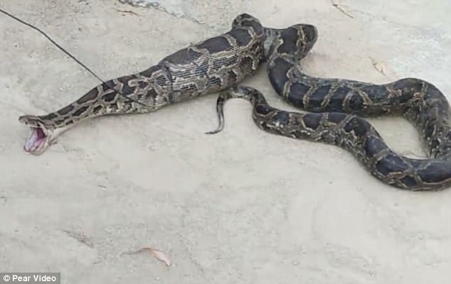 Theo Daily Mail, con trăn lớn bị dân làng Trung Quốc phát hiện. Không lâu sau đó, nó bắt đầu nôn ra một con gà và một con vịt.