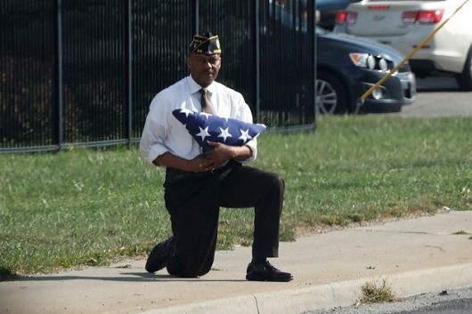 Cảnh chào đón đoàn xe là một người đàn ông quỳ gối trên vỉa hè, trên tay ôm một lá cờ của Mỹ đã được gấp lại.