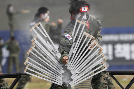 Một nữ binh sĩ đặc nhiệm Hàn Quốc thể hiện nội công bằng cách chặt gãy 15 miếng bê tông - Ảnh: AFP