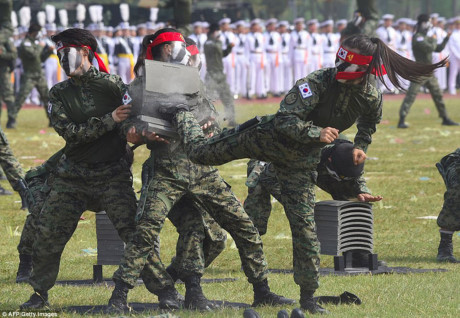 Các thành viên lực lượng đặc nhiệm Hàn Quốc trình diễn võ thuật với dao ngày 25-9 - Ảnh: AFP