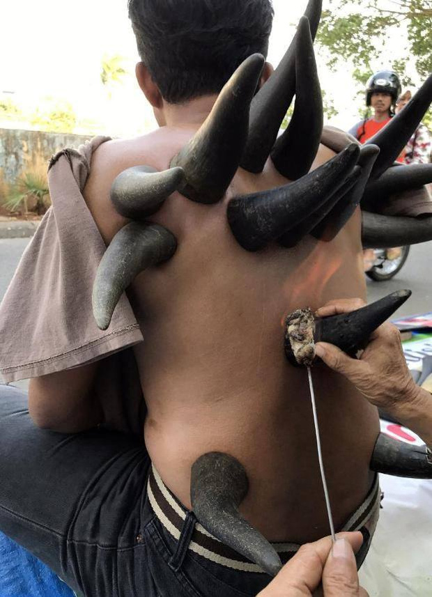 Trên thế giới có vô số những phương pháp chữa bệnh, trị liệu kỳ lạ, từ việc cho cá rỉa chân để loại bỏ những mảng da chết cho tới chui vào lồng gà để xông hơi tại Thái Lan. Tuy nhiên mới đây, một phương pháp trị liệu mới gây xôn xao trên mạng xã hội: những thợ mát xa - trị liệu tại Indonesia sử dụng sừng trâu để cải thiện tuần hoàn máu và giảm đau cho bệnh nhân.