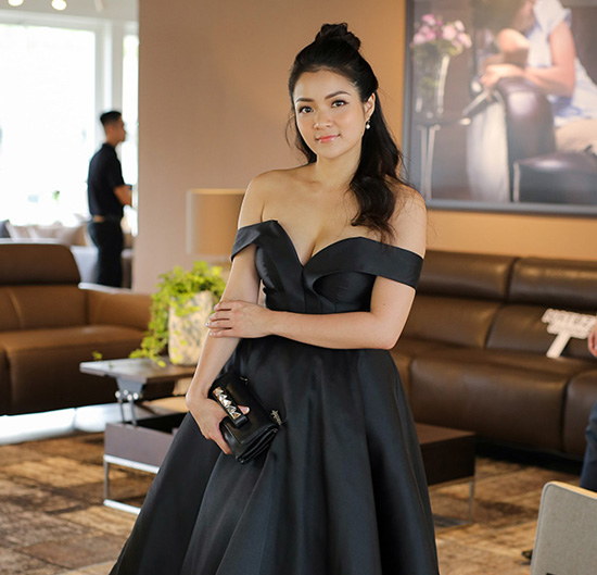 Diện trong chiếc váy đen xòe ôm vòng eo thon. Thủy Top vẫn gợi cảm và sexy như ngày nào, khi cô khoe vòng một “khủng” trứ danh của mình.