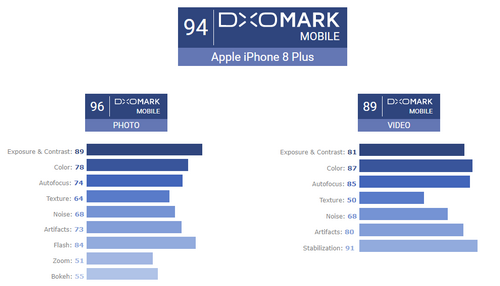 Trước đó, iPhone 8 Plus được Dxomark đánh giá cao ở khả năng chụp ảnh HDR, chụp bokeh và nhận dạng khuôn mặt nhanh cũng như quay video có độ ổn định cao, màu sắc đẹp và theo dõi chủ thể tốt cả trong ánh sánh mạnh.