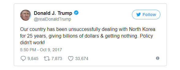 Theo Fox News, trong dòng trạng thái trên tài khoản Twitter sáng sớm nay 9/10, Tổng thống Trump viết: “Đất nước chúng ta đã thất bại trong việc ứng phó Triều Tiên suốt 25 năm, chúng ta đã cấp cho họ hàng tỷ USD nhưng không nhận lại được gì. Chính sách của chúng ta đã thất bại”.