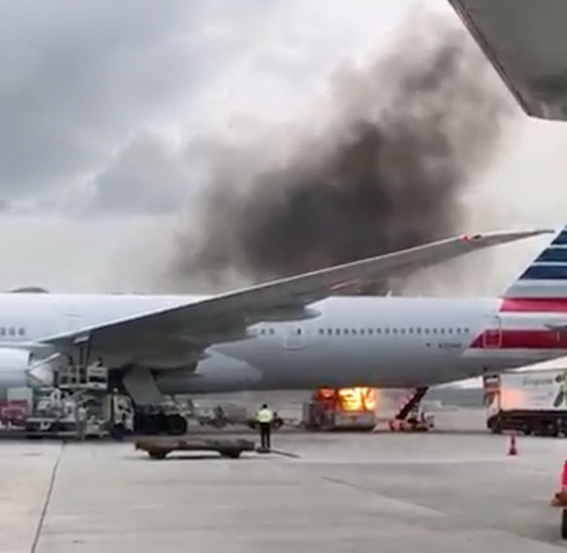 Đám cháy xuất phát từ phần bụng của một chiếc máy bay thuộc Hãng hàng không American Airlines của Mỹ và khói đen bốc lên cuồn cuộn.