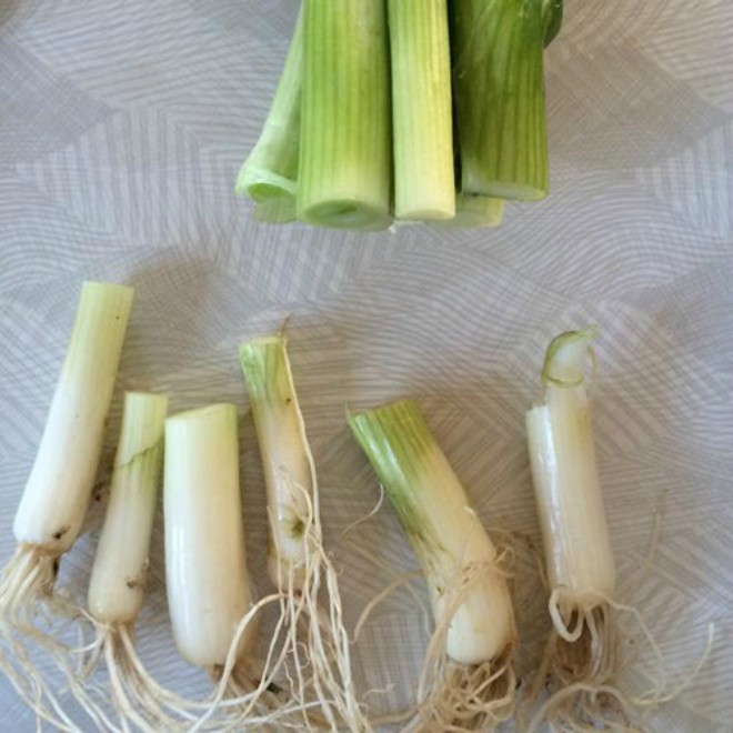 Hành lá sau khi cắt phần ngọn để sử dụng, bạn giữ lại phần rễ khoảng 5cm để trồng tiếp cây mới.