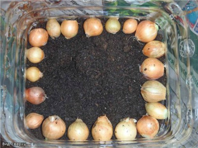 Đổ 1 lớp đất mùn mịn khoảng 5-7cm xuống đáy bình, xếp lần lượt các củ hành xung quanh sao cho phần rễ hướng vào trong, phần ngọn hướng ra ngoài phía các lỗ trống đã được khoan trước đó.