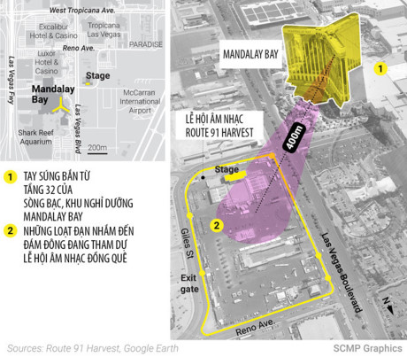 Khoảng cách từ vị trí của tay súng đến các nạn nhân là 400 m với tầm ngắm rất rộng. Đồ họa: South China Morning Post.
