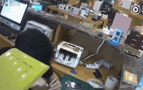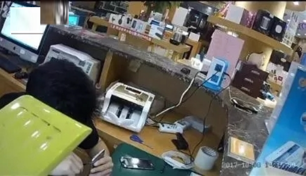 Sự việc xảy ra vào chiều ngày 8/10 vừa qua bên trong một cửa hàng sửa chữa điện thoại nằm trên đường Hương Tích Tự, thành phố Hàng Châu, tỉnh Chiết Giang, Trung Quốc và được ghi lại bởi hệ thống máy quay giám sát.
