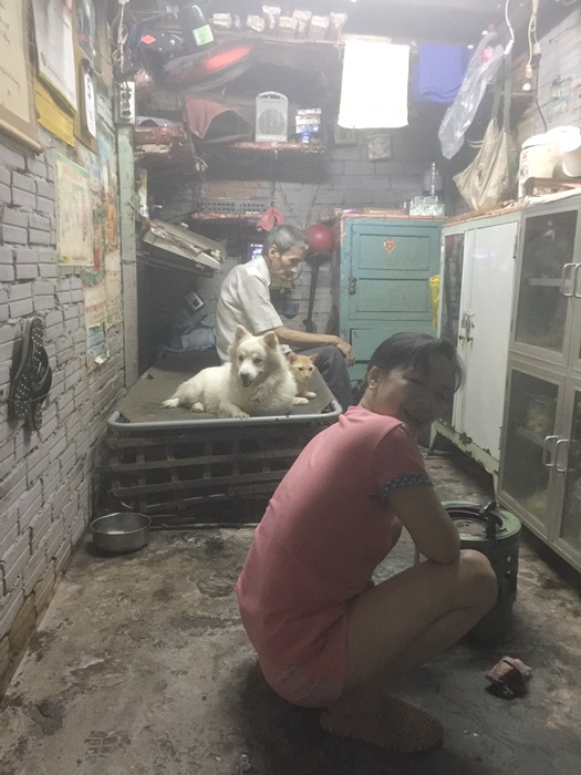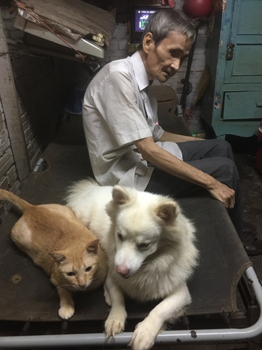 Ông ngồi trên ghế bố. Bên cạnh, một con chó và một con mèo quấn quýt. Con gái ông đang ngồi dưới nền nhà sửa chiếc bếp dầu hôi.