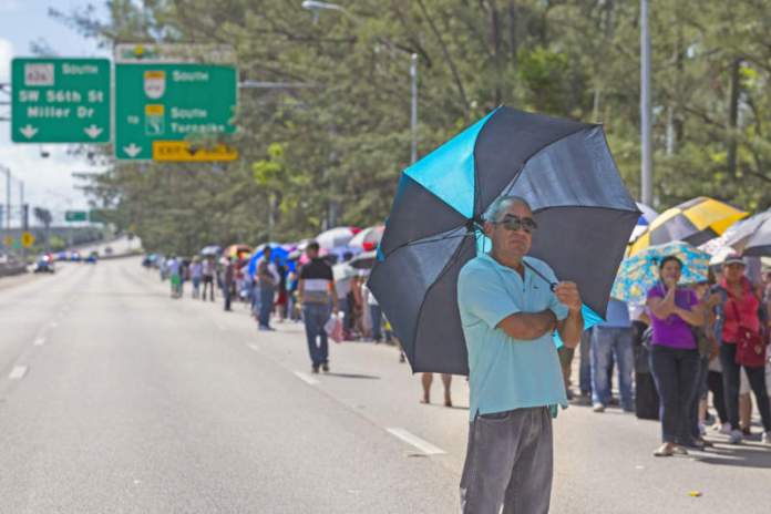 MIAMI, Florida (NV) – Hàng chục ngàn người dân vùng Nam Florida hôm Chủ Nhật đứng xếp hàng trong nhiều tiếng đồng hồ dưới ánh nắng chói chang để đợi đến lượt mình được nộp đơn chương trình trợ cấp thực phẩm đặc biệt, chỉ dành riêng cho các nạn nhân bão Irma, khiến giới hữu trách hết sức ngạc nhiên, do nghĩ rằng số người tới sẽ ít hơn rất nhiều.