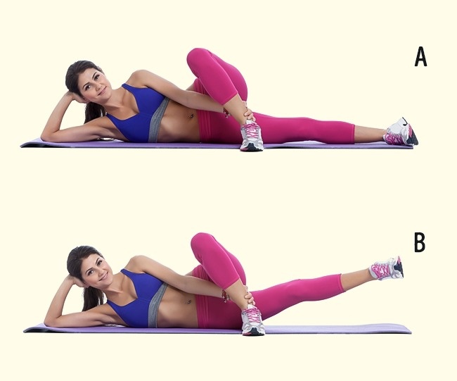 Chuẩn bị ở tư thế nằm nghiêng, một tay chống đầu, một tay đặt xuống sàn. Thực hiện động tác nâng chân lên cao 45 độ 30 lần rồi đổi bên.