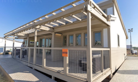 Được thiết kế để tận dụng tối đa ánh sáng tự nhiên và để không khí lưu thông, ngôi nhà được xây dựng với một mái hiên phía bắc dài với mái vòm trong suốt cho phép chủ nhân tận hưởng không gian ngoài trời.