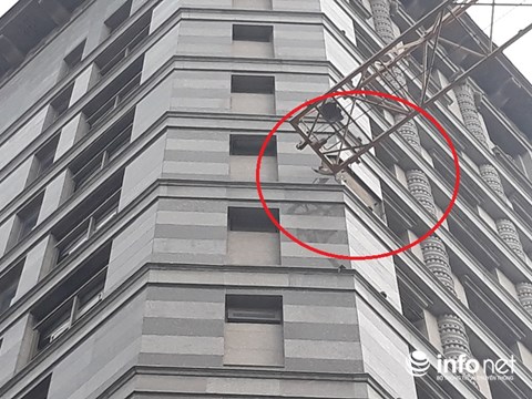 Một đầu cần cẩu va trúng tường tòa nhà ngân hàng. Sự việc đã khiến cho các miếng gạch ốp tường vỡ vụn rơi xuống dưới. Trúng hai xe ô tô ở bên dưới bị vỡ nát kính.