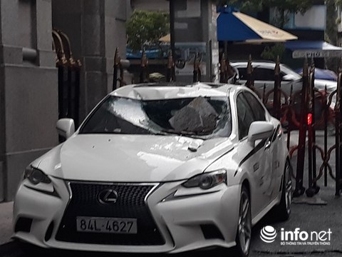 Tại hiện trường, hai ô tô bị bể nát kính chắn gió phía trước, một mảng tường nhà bị bể, nhiều mảnh vỡ văng khắp đường.