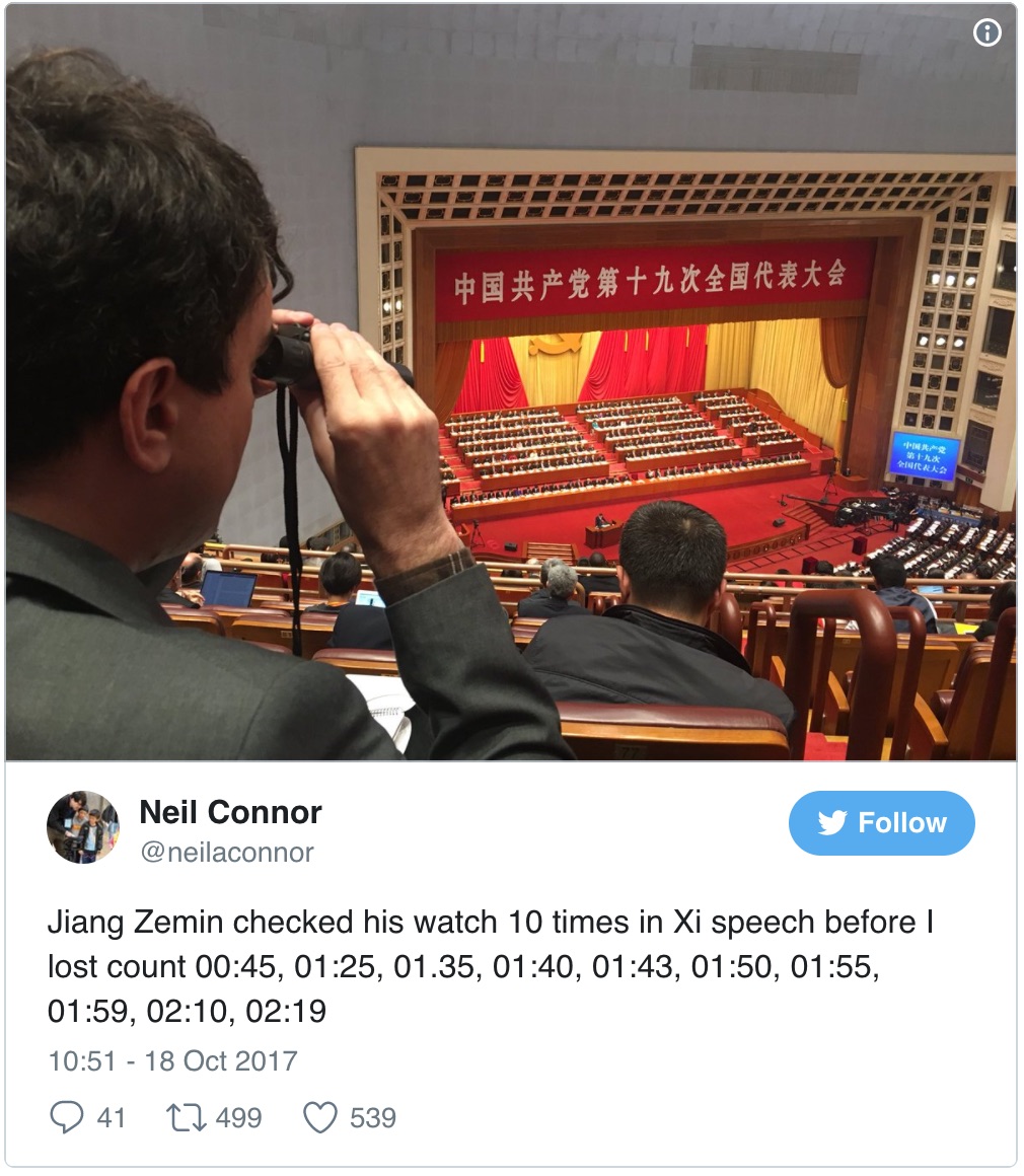 Phóng viên Neil Connor của tờ Telegraph cho biết trên mạng xã hội Twitter: “Giang Trạch Dân nhìn đồng hồ 10 lần khi ông Tập phát biểu, sau đó tôi cũng không đếm nổi nữa”.