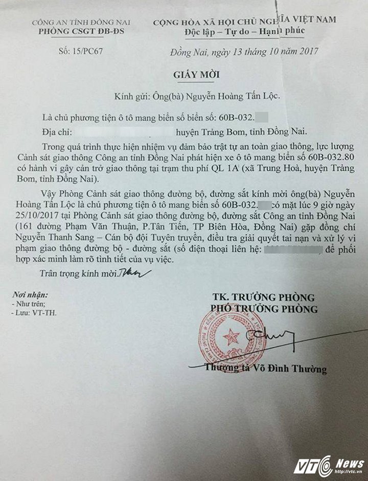 Ngày 18/10, Thượng tá Võ Đình Thường - Phó Phòng CSGT Đường bộ - Đường sắt, Công an tỉnh Đồng Nai ký giấy mời, mời 20 tài xế dùng tiền lẻ trả phí qua trạm BOT Biên Hoà trên quốc lộ 1 (đoạn qua xã Trung Hòa, huyện Trảng Bom, Đồng Nai) lên trụ sở làm việc.