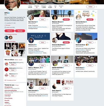 Một cách chọn lọc, KFC chỉ theo dõi 11 người trên Twitter: 5 thành viên của nhóm nhạc nữ đình đám thế giới một thời Spice Girls bao gồm Geri, Mel B, Mel C, Victoria và Emma, cùng với 6 người đàn ông tên Herb.