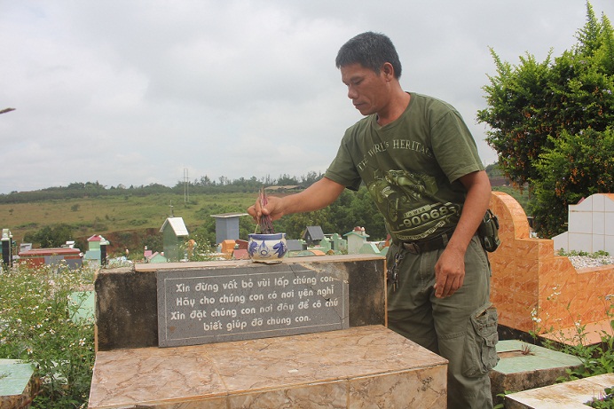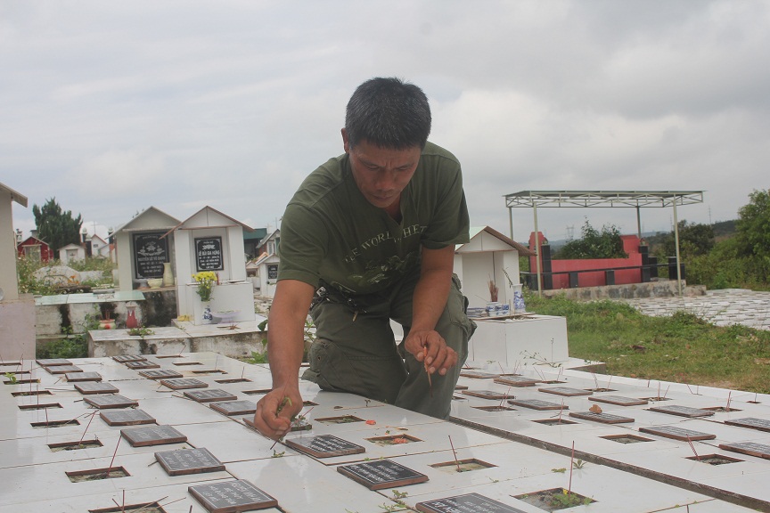 Tờ mờ sáng, cầm gói bánh và thẻ hương bước vào ngôi nhà nguyện nhỏ giữa 21.500 sinh linh nhỏ bé, chúng tôi đã thấy cụ Tâm đang dọn dẹp xung quanh, hương khói cho các cháu. Đằng xa có một người đàn ông đang miệt mài quét sơn bên những dãy mộ trắng xóa, lại gần tôi mới biết đó là ông Phụng.