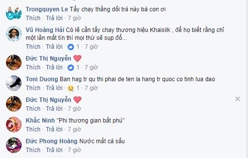 Trên các trang mạng xã hội, sự phẫn nộ với Khaisilk thể hiện rất rõ. Tài khoản tên Thế Tùng trên Facebook bình luận “Sụp đổ, chán toàn tập. Nói hay lắm nhưng rồi cũng là gian thương. Mọi người nên tẩy chay thương hiệu Khaisilk”.
