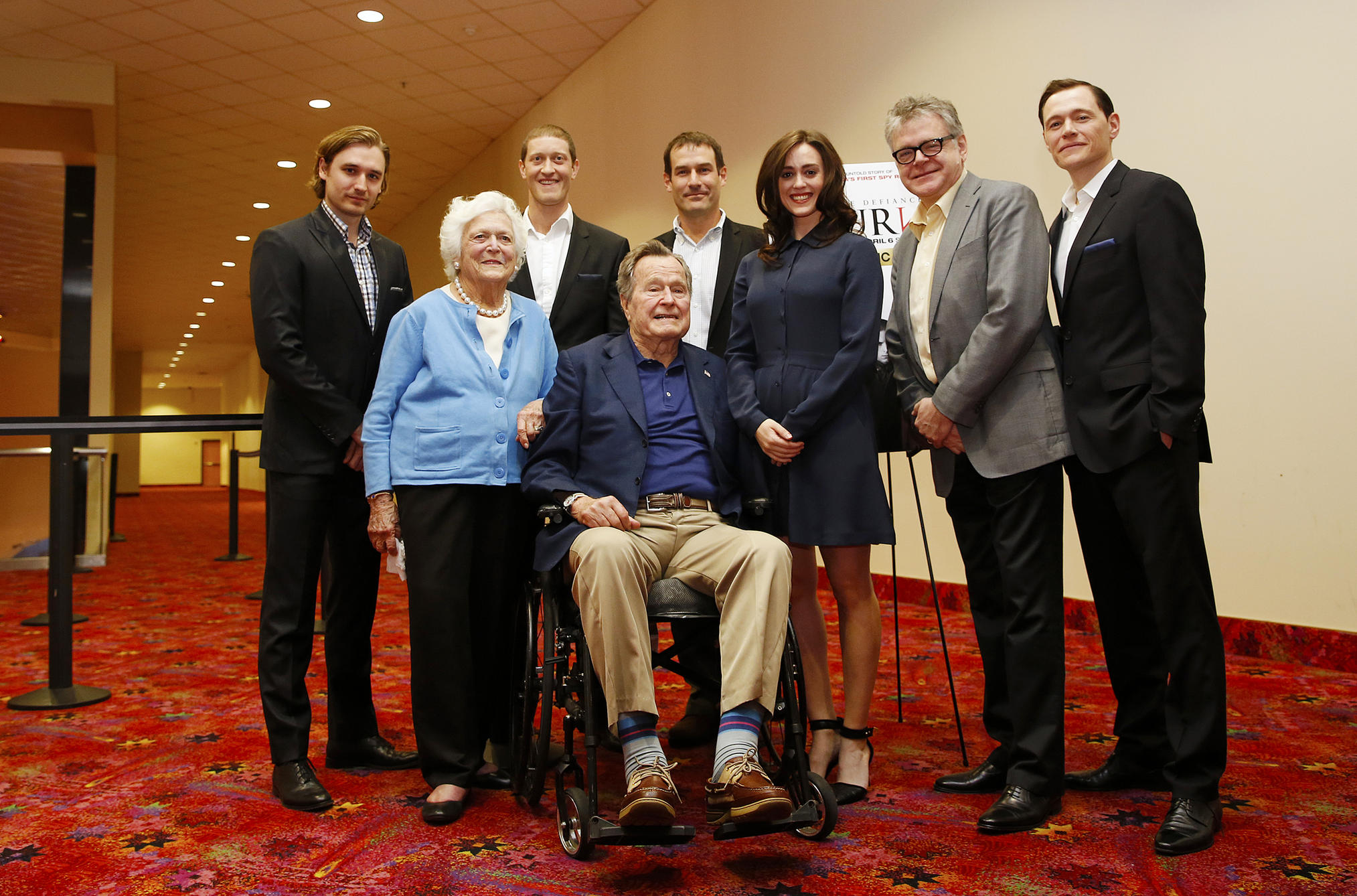 Ông George H.W. Bush đang chụp hình chung với các tài tử đóng trong phim truyền hình 'TURN' tại Houston vào tháng Ba, 2014 với cô Heather Lind đứng bên cạnh ông. (Aaron M. Sprecher / Invision for AMC)