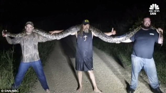3 thợ săn ở Mỹ bắt được trăn dài khoảng 5,5 mét ngay trong đêm. Con trăn cố gắng vùng vẫy nhưng cuối cùng cũng phải khuất phục. Họ càng kéo con trăn nấp bụi cây thì càng thấy dài.