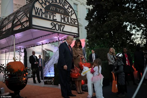 Không khí lễ hội Halloween vui mừng, sôi nổi tại Nhà Trắng. Tổng thống Trump và đệ nhất phu nhân Melania bắt tay và phát kẹo cho trẻ em, chụp ảnh với hàng ngàn trẻ em đi qua cổng Nhà Trắng.