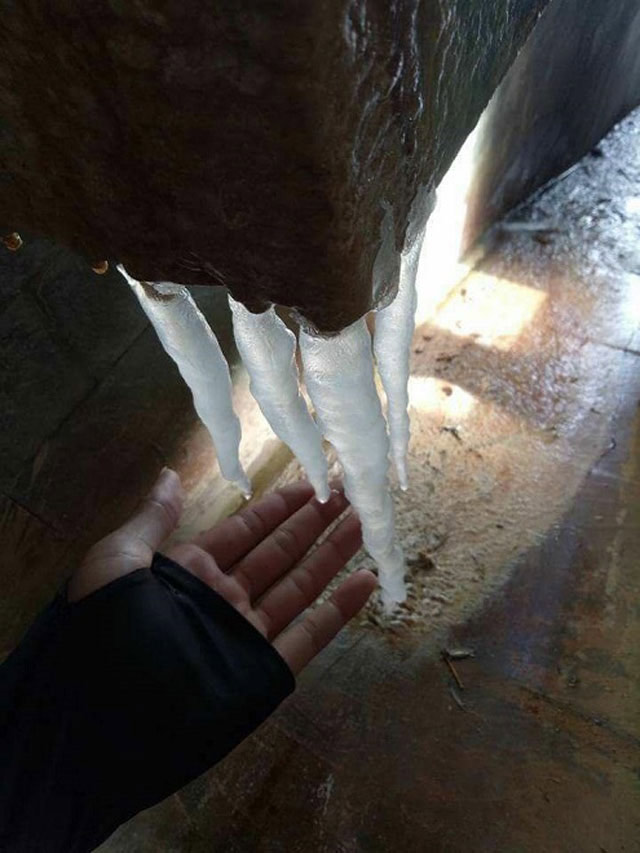 Một số giọt nước ở khe đá đóng băng thành hình lưỡi kiếm. Ảnh Nguyễn Viết Mai.