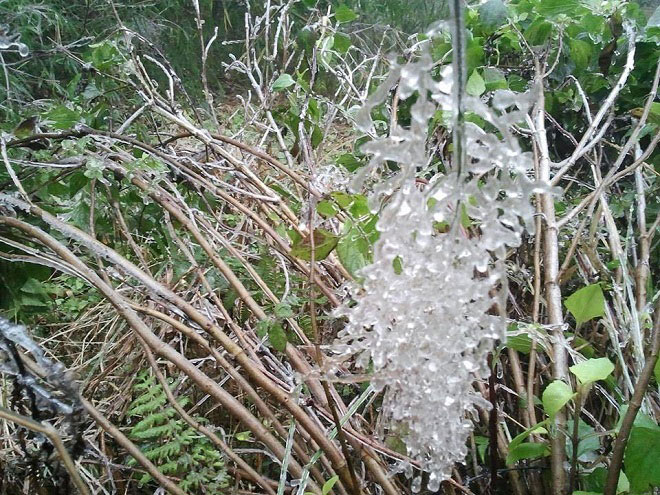 Trước đó, sáng 31/10, nhiều du khách du lịch ở đỉnh Fansipan cũng bắt gặp cảnh tượng khá hiếm. Nhiều cây cối, cành lá trên đỉnh núi phủ một lớp băng giá trong suốt. Một số triền núi dốc, nước bị đóng băng thành hình lưỡi kiếm rất đẹp.