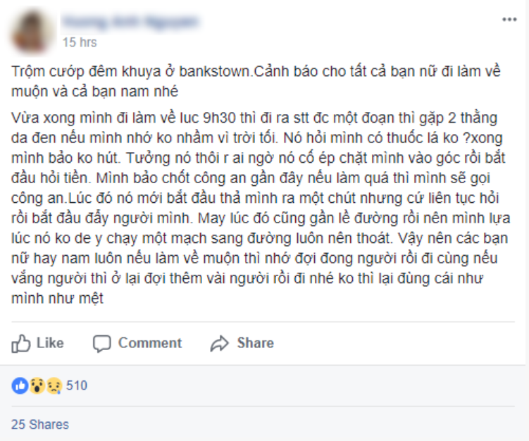 Bài viết được đăng lên mạng xã hội nhằm cảnh báo cho các bạn người Việt khác về sự nguy hiểm của khu Bankstown đã nhận được sự quan tâm của rất nhiều thành viên. Với hơn 500 lượt react cùng nhiều bình luận ủng hộ, tất cả đều cho rằng việc đi một mình vào buổi tối tại nhưng khu ngoại ô là vô cùng nguy hiểm.