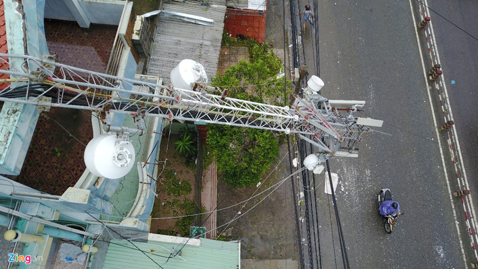 Cũng trên đường Lê Hồng Phong còn có một cột thu phát sóng viễn thông khác bị đổ sập, lơ lửng trên dây điện.
