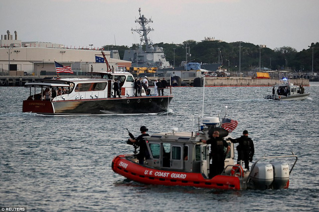 Quá trình di chuyển tới đài tưởng niệm USS Arizona của Tổng thống Trump và phu nhân được Lực lượng tuần duyên Mỹ bảo vệ nghiêm ngặt. (Ảnh: Reuters)