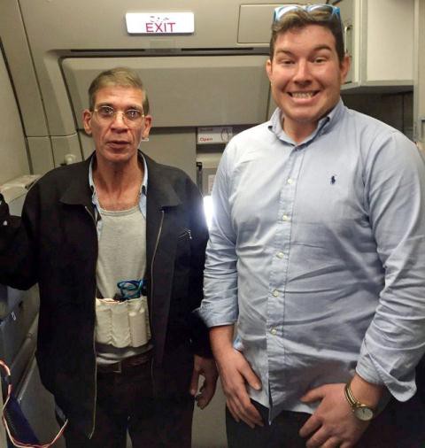 Tên không tặc Mostafa (trái) chụp ảnh tự sướng với hành khách - Ảnh: Twitter