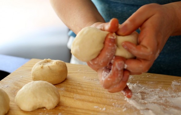 8. Rải phần bột c̣n lại trên mặt bàn (hoặc mặt tấm thớt to). Thả quả banh bột xuống mặt bàn. Tiếp tục nhồi bột cho tới khi bột không dính vào ngón tay. Chia quả banh bột thành 6 cục banh nhỏ đều nhau.