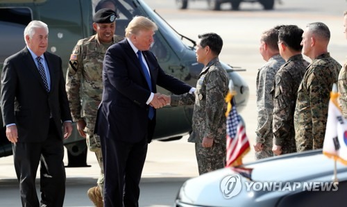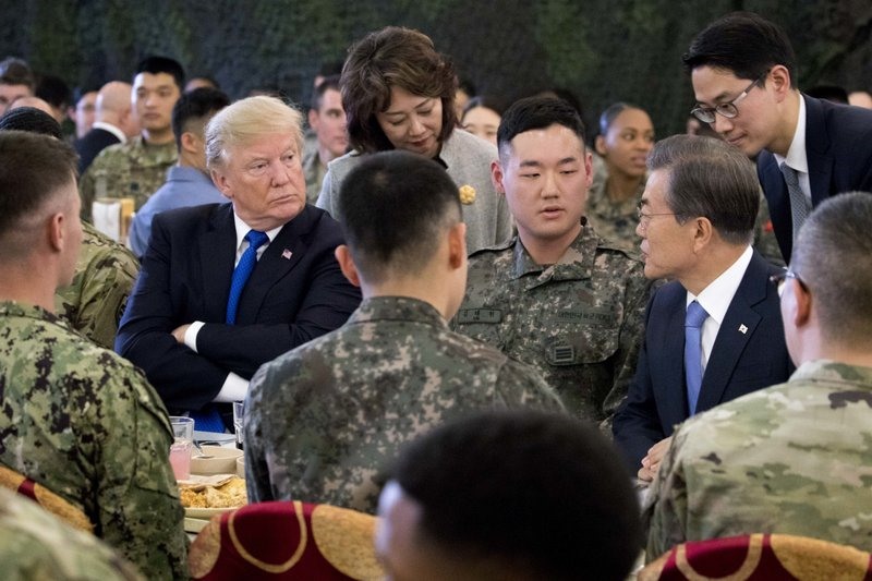 Tại căn cứ cách Seoul 70km về phía nam, Tổng thống Mỹ được Tổng thống Hàn Quốc Moon Jae-in chào đón. Tổng thống Hàn Quốc và Tổng thống Mỹ đã ăn trưa với quân đội liên quân Mỹ - Hàn Quốc trong một căn phòng lớn.