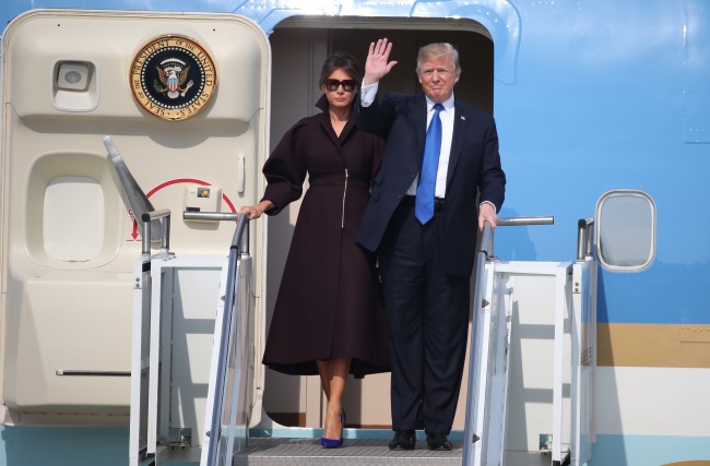 Ông Donald Trump đặt chân tới căn cứ không quân Osan ở tỉnh Gyeonggi vào 12h18, giờ địa phương, trước sự chào đón của Bộ trưởng Ngoại giao Hàn Quốc Kang Kyung-wha và ông Cho Yoon-je - tân Đại sứ Hàn Quốc tại Mỹ.