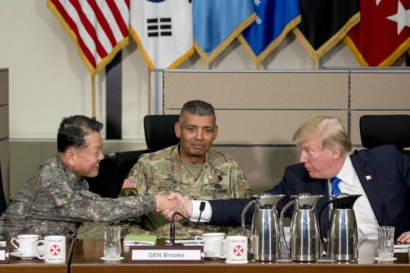 Tổng thống Donald Trump bắt tay với Tướng Jeong Kyeong-doo - Chủ tịch Hội đồng tham mưu trưởng liên quân (JCS) của Hàn Quốc khi đến doanh trại Humphreys ở Pyeongtaek, tỉnh Gyeonggi. Ảnh: Yonhap