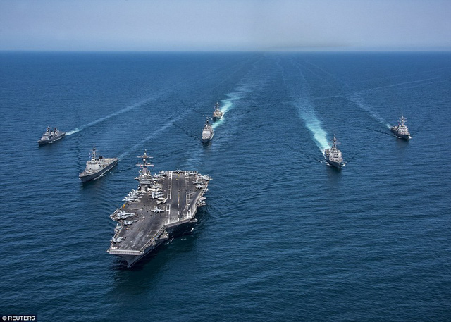 Cùng lúc đó, nhóm tàu tấn công do tàu sân bay USS Carl Vinson dẫn đầu, bên cạnh là tàu khu trục có trang bị tên lửa hành trình lớp Arleigh Burke cũng đang trong hành trình tiến sát vùng biển Triều Tiên.