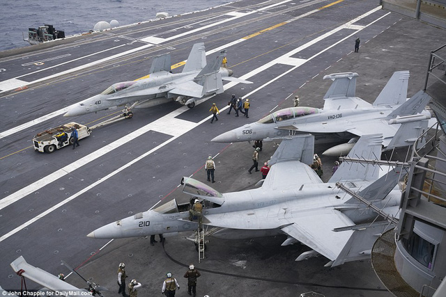 Dàn tiêm kích khủng trên boong tàu sân bay USS Carl Vinson. Ảnh: Dailymail