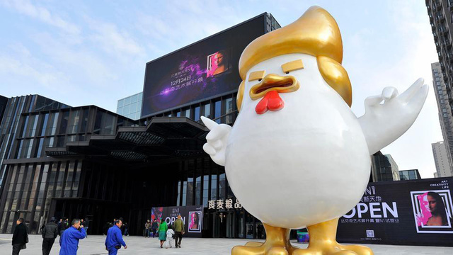 Bức tượng chú gà – linh vật năm Đinh Dậu, với mái tóc và điệu bộ “y chang” ông Trump được dựng lên ở một thành phố Trung Quốc sau khi ông thắng cử hồi cuối năm ngoái. Các bức tượng nhỏ, mô hình bơm hơi của chú gà này bán đắt như tôm tươi, sang cả Mỹ và gây sốt trên báo đài thế giới – Ảnh chụp màn hình