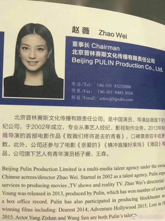 H́nh ảnh giới thiệu Triệu Vy tại APEC cùng ty Beijing Pulin Production của cô được chia sẻ rộng răi.